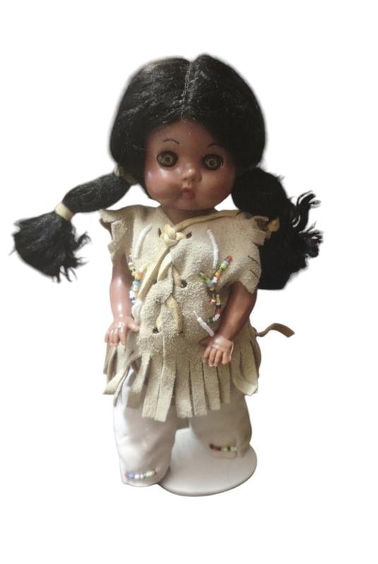 Вінтажна лялька американських індіанців канадського бренда Reliable Toy Company. Голова, руки та ноги ляльки рухомі, густе волосся, що сплять, з віями. Ручний розпис обличчя. Одяг, прикрашений бісером і шнурками, а також мокасини зроблені зі шкіри. Лялька має маркування Reliable на спині. Вінтаж 1960. Гарний вінтажний стан. Розмір: Висота ляльки — 21 см. Матеріали: Пластик Шкіра. Країна/регіон виробництва Канада.