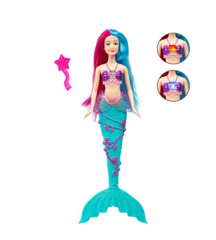 У кожної дівчинки є своя улюблена лялька, яка супроводжує її під час щоденних ігор і прогулянок. Фантастична лялька Вікі - справжня русалка, яка занурить вас у барвистий, казковий світ. - У ляльки світиться хвіст, рухливі руки і плавник. - Ви можете розчісувати її довге рожево-блакитне волосся і робити різні зачіски. - У набір входить гребінець у формі зірки. - Висота ляльки - приблизно 35 см. - Виріб відповідає вимогам безпеки - європейському стандарту EN71. - Іграшка призначена для дітей від 3 років.