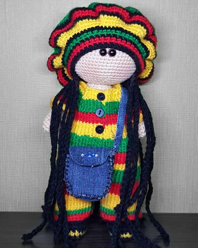 Лялька вʼязана гачком з напівбавовняної пряжі. Лялька в образі растаман, в єдиному екземплярі. Наповнювач гіпоалергенний кулькообразний холлофайбер. Очі пластикові, волосся вʼязане, комбез знімається, шапка не знімається. Розмір 20см. Якщо є питання- пишіть, з радістю відповім 💌