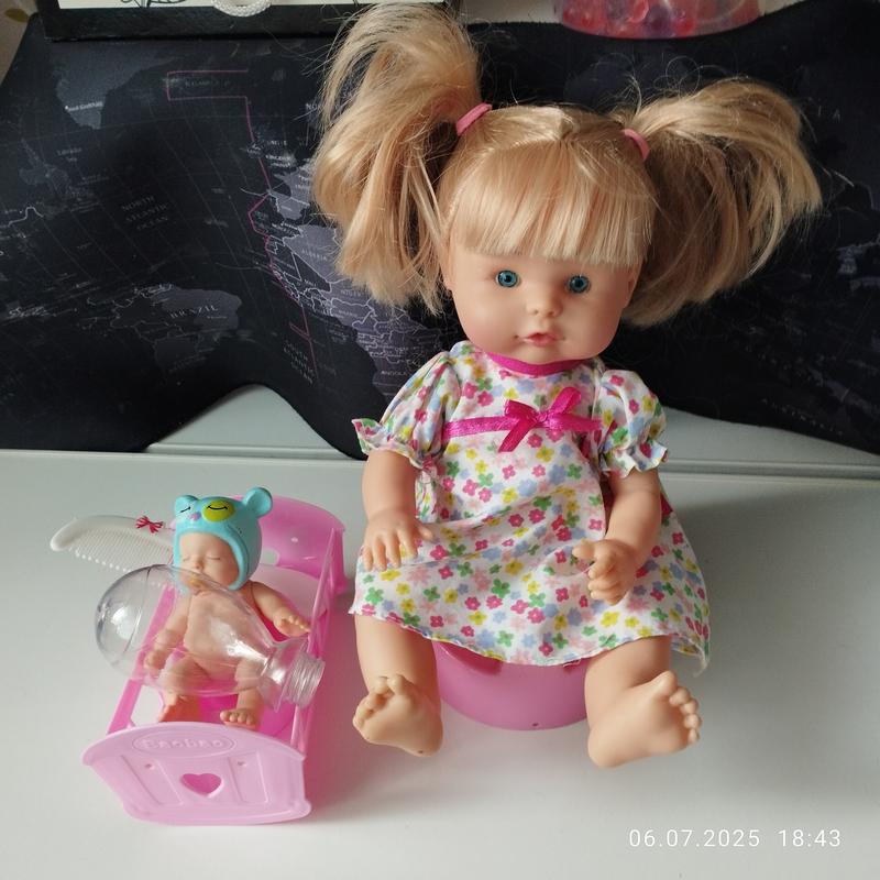 Набір лялька, горщик, пляшечка без насадки. Пупсик із ліжечком, горщиком і гребінцем. у подарунок. російською мовою. Фрази, пісня. Можна поїти, пісяє на горщик. Плаття та труси знімаються. Пересилаю. Дивіться також інші оголошення.