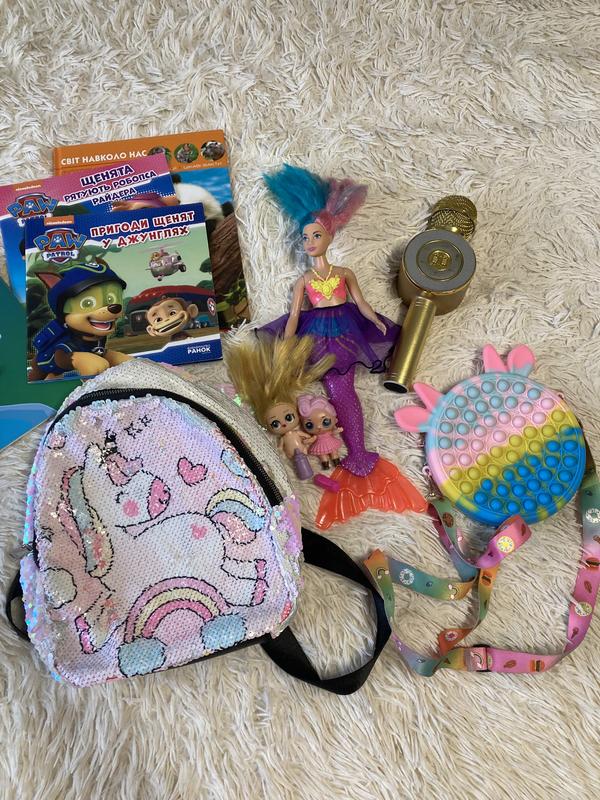 Іграшки бв Рюкзак з єдинорогом 200 грн Сумка pop it 160 Енциклопедія 150 Щенячий патруль по 60 Мікрофон 160 Лол 100 Бродилка 70