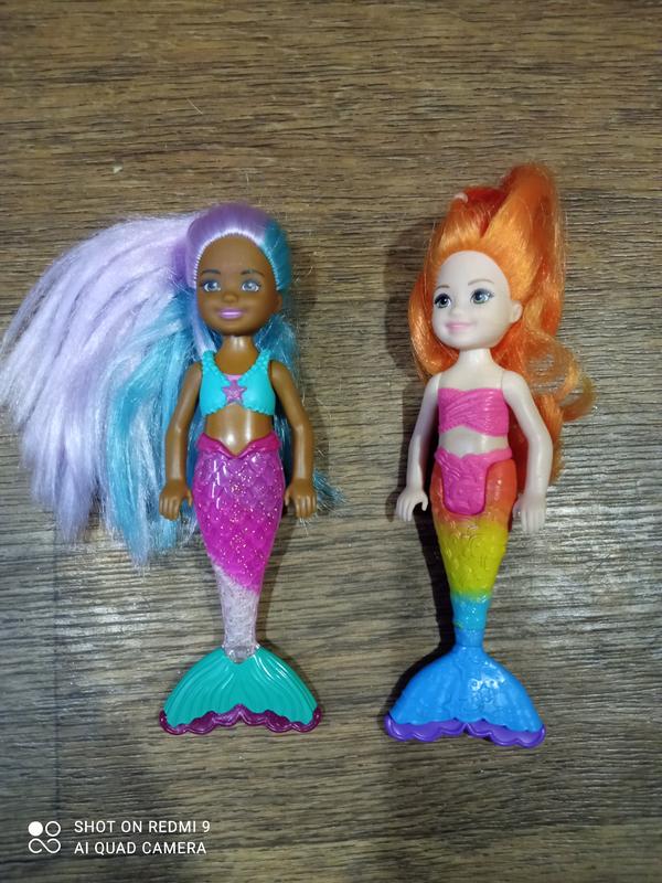 Куколки русалочки, продаются парой,темненькая фиолетовый волос и светленькая рыжая, в хвостиках у каждой спрятан гребешок