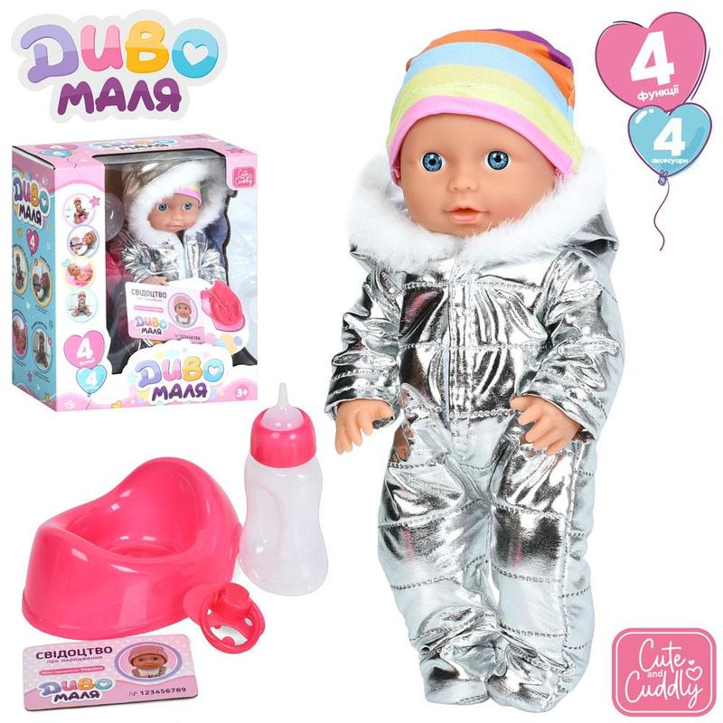 Диво маля-функціональний пупс , зріст 27 см Чарівний пупс з аксесуарами зможе стати Вашим ідеальним “малюком” Різноманіття аксесуарів та крутий функціонал допоможе розвити соціальні навички відповідальність отримати базові знання про догляд за дитиною, а також доповнити різні ігрові сюжети Вміє ходити на горщик Маля вміє питт з пляшечки Рухливі ніжки та ручки Можно купати пупса у ванній В комплекті до пупса до набору входить : свідоцтво про наррдження соска горшок пляшечка одяг-комбінезон шапочка Матеріал : пластмаса, тканина, гума Виробник : лімо