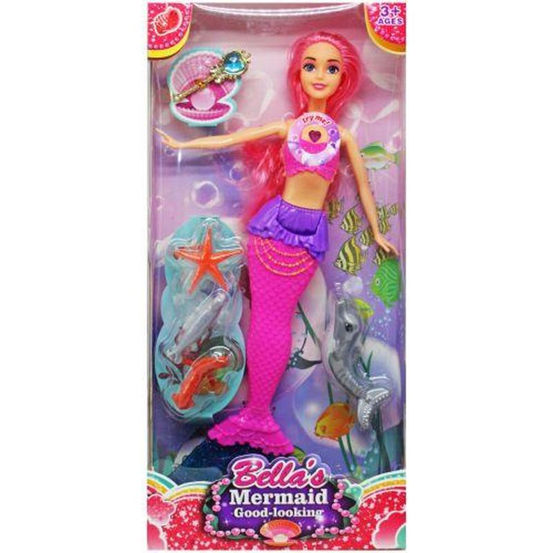 Гарна лялечка-русалка зі світловими та звуковими ефектами. Під час натискання на кнопку на грудях лялька починає співати та говорити фрази англійською мовою, сама кнопочка світиться. Голова, руки та хвіст рухливі. У наборі також є безліч аксесуарів — чарівна паличка та 4 фігурки підводних жителів. Висота ляльки — 33 см. Бренд: MIC Паковання: Коробка Колір: Рожевий Вага в упаковці: 275 г Габарити в упаковці: 5.5 x 18 x 37.5 см Габарити без паковання: 4 x 33 x 6 см Страна виробник: Китай Матеріал: Комбінований Комплектація: Лялька, чарівна паличка, 4 фігурки морських жителів