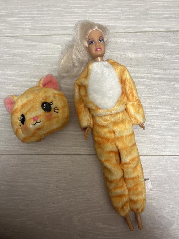 Лялька у дуже хорошому стані. Має цікавий одяг - костюм кота, куртка двостороння. Руки та ноги не зникаються. Голова хитається.