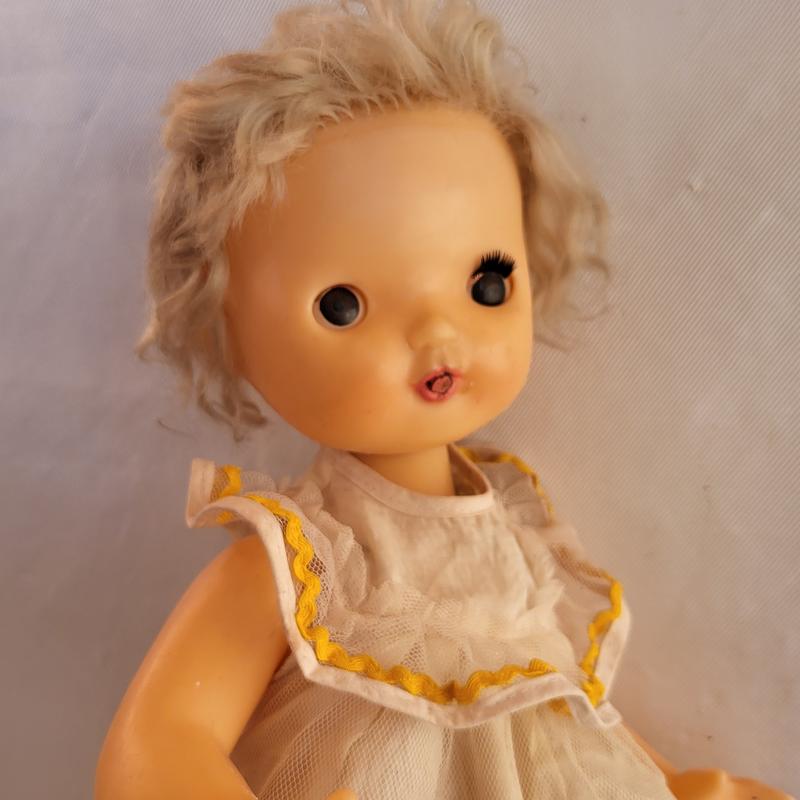 Лялька із соскою, СРСР. Немає вії правого ока, , тому око періодично провертається. Волосся прошитий.