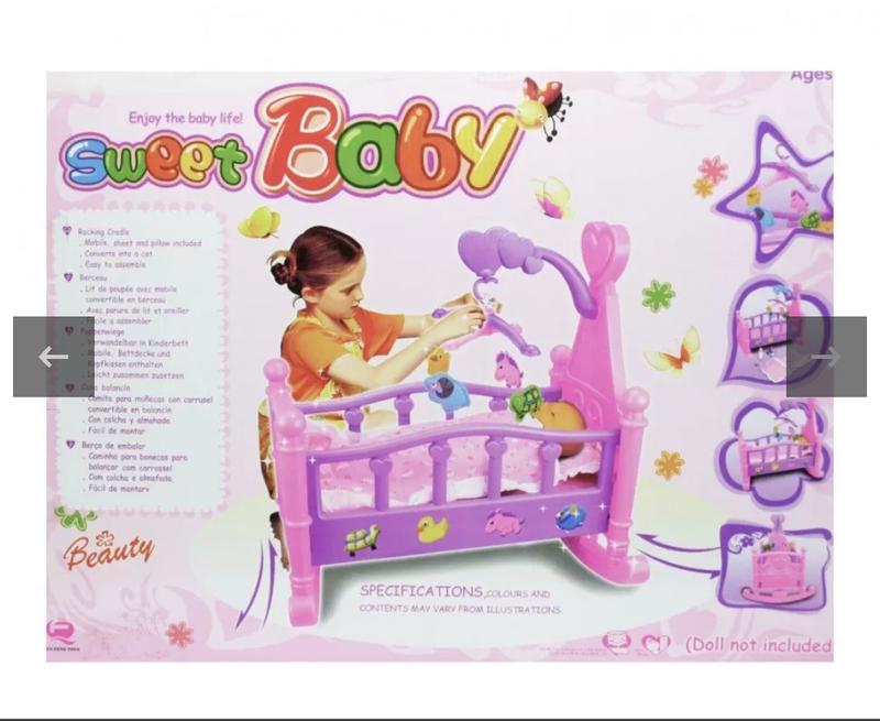 Кровать скалка с мобилем (настоящим). Кровать объемная, большая, легкая, все углы сглажены. Ребенок не травмируется. Очень красиво, как настоящая.Есть коробка. Крючок от мобиля был поломан, но все поладее.Дочка почти не гралась.Все в хорошем состоянии.