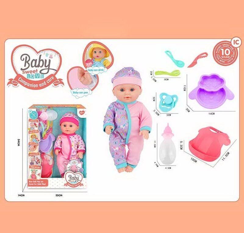 Малюк, який оживає в грі! Цей милий пупсик стане справжнім другом для дитини, навчаючи турботи та відповідальності. Його можна годувати з пляшечки, колисати, вкладати спати, а після пиття він ходить у туалет — як справжнє немовля! Гра з пупсиком допомагає розвивати емоційний інтелект і стимулює фантазію. Ідеальний вибір для сюжетно-рольових ігор удома чи в садочку. Особливості: - пупсик у знімному одязі; - може пити воду з пляшечки та ходити в туалет; - звукові ефекти: плаче, сміється, говорить (всього 10 звуків); - набір аксесуарів: пляшечка, тарілочка, ложка, вилка, ніж, слинявчик, пустушка; - розмір ляльки: 30 см; - пластикове тіло та гумова голова; - перед грою вийміть музичний чип та витягніть заглушку; - працює від батарейок (в комплекті).