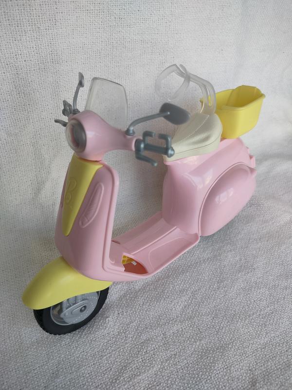 Скутер для барбі. В ідеальному стані. Колеса гумові. Єдине що, то це загублена підніжка та песик який був позаду в корзині. Розмір: 28см×20см.