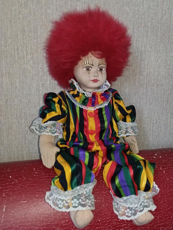 Это коллекционная кукла-клоун, винтажная модель Имеет яркие красные волосы и характерный грим лица. Одетая в полосатый комбинезон с декоративными пуговицами и кружевом. Длина 58 см.