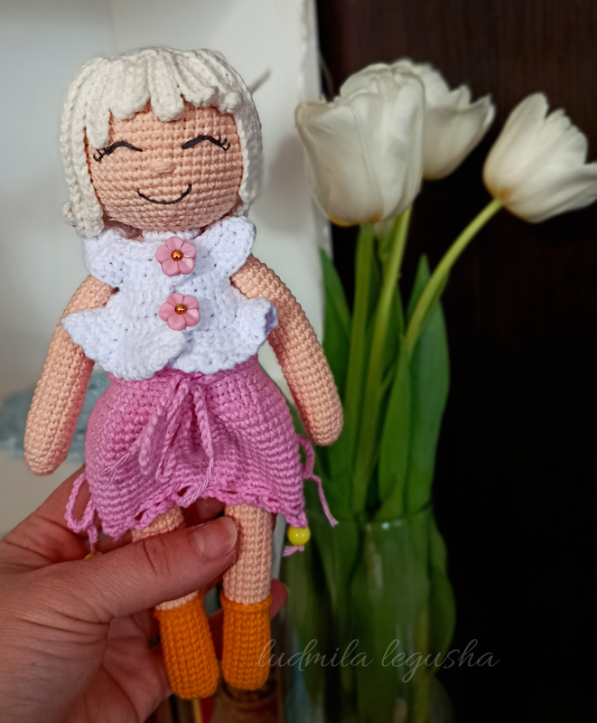 В'язана гачком лялька Оченята вишиті Одяг знімається Волосся (паричок) приклеєні клеєм ПВА. Ручки та ніжки пришиті.