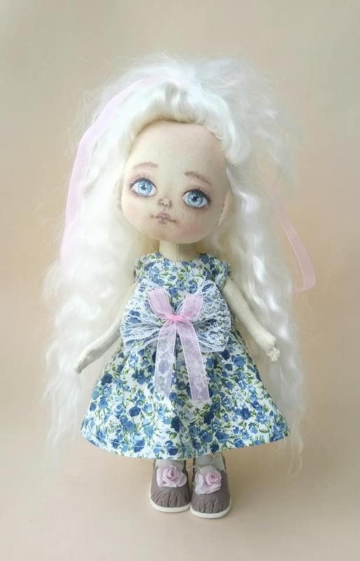 Текстильна лялька руки ноги і голова повертається, вся одяг і взуття знімається. У ляльки два платтячка можна переодягати. Текстильна лялька зшита з бавовни. Волосся шерсть ангорської кози можна акуратно робити зачіски . Догляд суха чистка.
