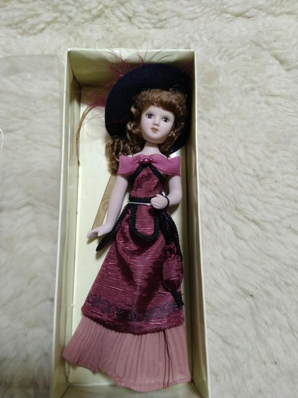 шикарая порцелянова лялечка з колекції Пані епохи. В ідеальному стані. Розмір 18 див. З коробочкою для зберігання.пір'я на капелюшку, атласна сукня,складний низ,маленька сумочка, всі деталі відповідають образу і епохи чудовий подарунок .в наявності є багато інших лялечок цієї колекції