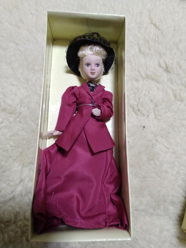 Красива порцелянова лялечка з колекції Пані епохи. В ідеальному стані. Розмір 18 див. З коробочкою для зберігання.пір'я на капелюшку, шовкове плаття,бафи на рукавах, все відповідає моді епохи, чудовий подарунок .в наявності є багато інших лялечок цієї колекції