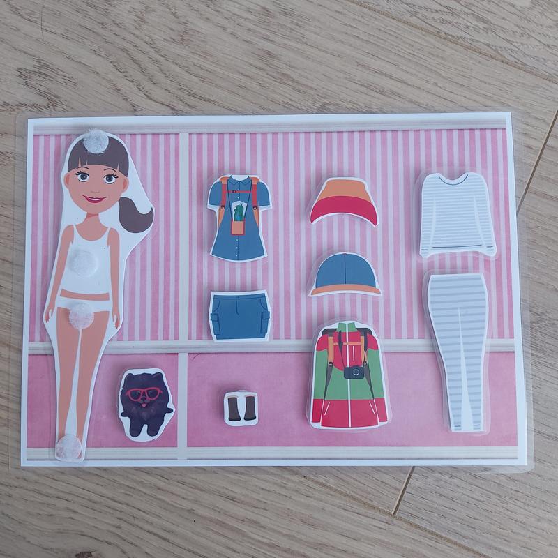 розвиваюча гра "Лялька з одягом" до складу входити: - основа А5 ламінована - ламінована Лялька на липучках - 5 елементів одягу - 2 головних убори - взуття - песик Можна скомбінувати декілька сторінок в 1 книгу. Вартість 1 сторінки 50 грн.