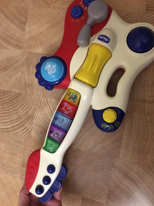Електронна гітара Chicco з трьома функціями гри: 5 коротких мелодій, 15 мелодій у трьох музичних жанрах, мелодії тварин. На ній можливо виконувати 3 музичні жанри — рок, поп і блюз. Записані мелодії можна поліпшити за допомогою трьох різних функцій мікшера: ролер, барабанне встановлення, прискорення ритму. Серйозна іграшка для дитини, що тягнеться до музики. від 3 років.