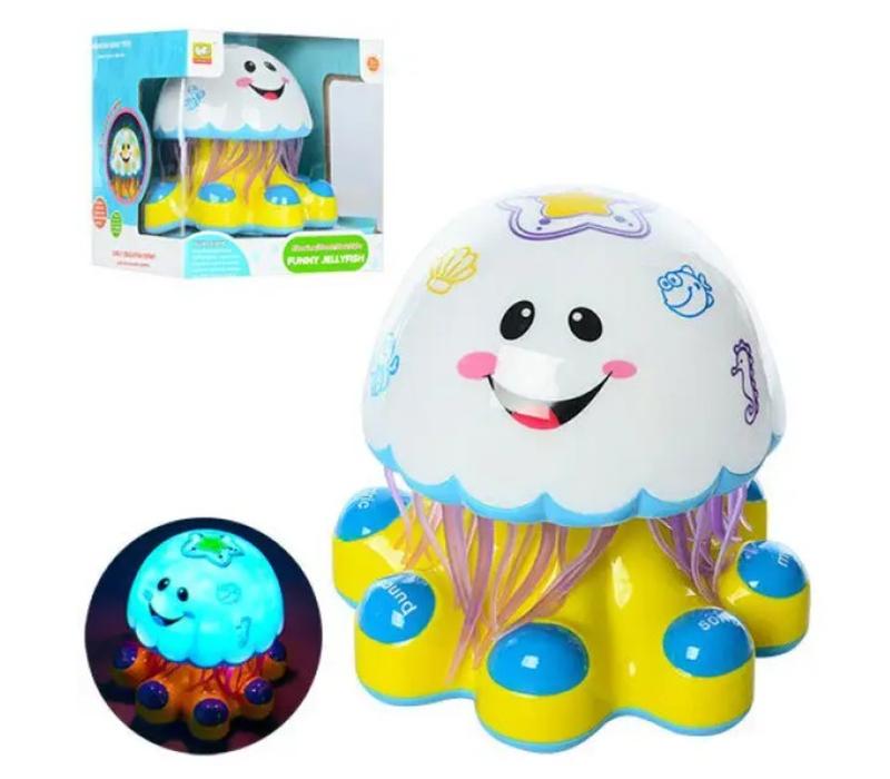 Розвиваюча музична іграшка медуза Весела, музична іграшка, яка розважить малюка, навчаючи його при цьому взаємодії з предметами. Сама медуза здатна грати музику, світитися і їздити в довільних напрямках. Вимовляє фрази англійською мовою. Короткий опис: Яскравий барвистий дизайн. Звукові і світлові ефекти. Танцює і їздить. Обходить перешкоди, зустрічаючи їх на своєму шляху Працює від батарейок Матеріал: пластик Розмір коробки: 19 х 20 х 18,5 см.