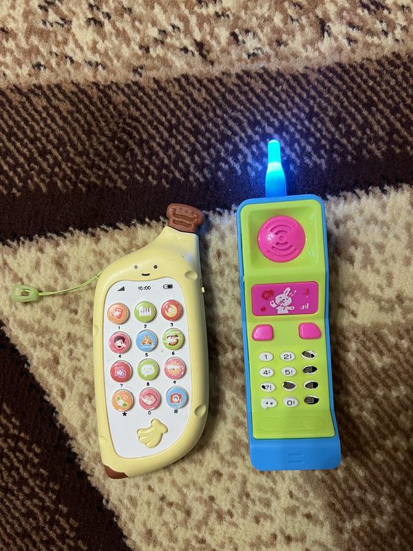 Жовтий телефон в ідеальному стані, він ще й має зверху коричневий гризунець. Говорить, співає, розповідає. Голубий також світиться та працює, але має трохи дефектів. Другий дарую просто в подарунок. Ціна як за 1
