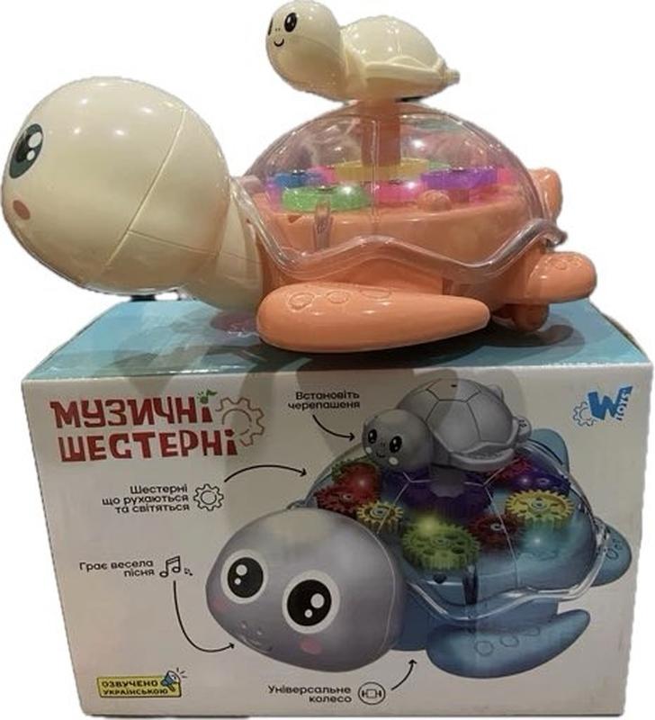 Гра "Черепашка" ТК 68507 "WToys", 3 види, УКРАЇНСЬКЕ ОЗВУЧУВАННЯ, звук, підсвічування, шестерні, колесо вільного ходу Черепашка від ТМ "WToys" - веселий друг малюків, який завжди готовий до веселощів! Яскрава іграшка з прозорим корпусом не дасть дитині нудьгувати: достатньо увімкнути активний режим, і Черепашка почне рухатись та співати веселу пісеньку українською. Кольорові шестерні починають рухатись та підсвічуватись яскравим світлом. Черепашка ніколи не втомлюється та завжди готова прикрасити дозвілля малюка! Особливість : стильний оригінальний дизайн черепашки;іграшка не має гострих кутів; маленька дитинка-чеперашка, яка кріпиться на панцир; опрацьований корпус та гарна деталізація тваринки; тваринка обладнана колесом вільного ходу; прозора поверхня панцира; різнобарвні рухливі шестерні; яскраве кольорове підсвічування; весела динамічна українська пісенька; міні-черепашка крутиться навколо своєї осі разом з шестернями; ефекти працює від 3-х батарейок типу "АА" (не входять до комплекту); іграшка виготовлена з міцного та безпечного для здоров'я дитини пластику. Характеристики Розмір упаковки: 21 см × 9.5 см ×14 см Паковання: Коробка Вік: від 3 років