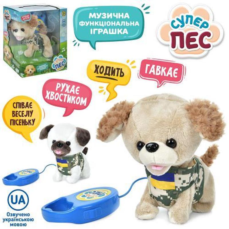 Музична функціональна іграшка "Супер пес", 16 см. Собачка на дистанційному керуванні. Ходить, гавкає, рухає хвостиком, співає пісні. Озвучення українською мовою. Живлення - батарейка. Матеріал - плюш. Паковання — коробка. Розмір - 21х14х25 см.