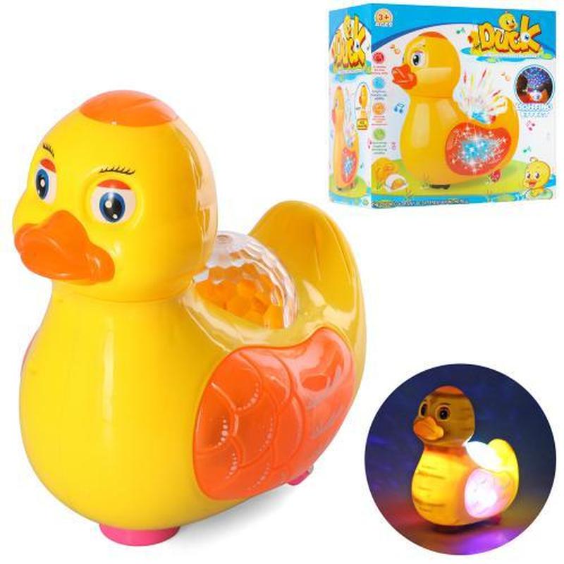 Музична іграшка "Качечка", 20,5 см. Є музичний супровід, світлові ефекти. Самостійно їздить. Живлення - батарейки. Матеріал - пластик. Упаковка - коробка. Розмір - 18,5х14х19 см.