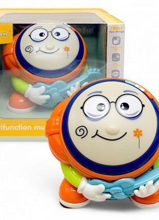 Музыкальная игрушка в виде Барабана-музыканта. Особенности: - Яркая подсветка - Поет веселые песни, в том числе и известные хиты (на английском) - Разнообразные мелодии - Веселые звуки - Звуки барабана при ударе рукой - Анимированное лицо - Танцует (ездит в разные стороны) Работает от аккумулятора (есть в комплекте).