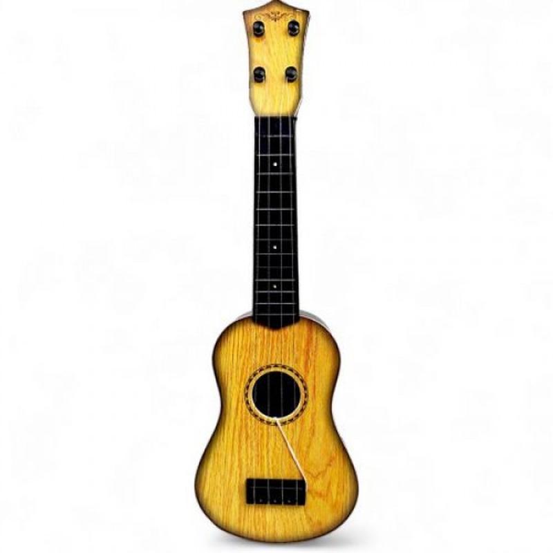 Чотириструнна гітара (укулеле), маленький дублікат справжнього інструменту. Має м'які металеві струни та пластикові кольї, які регулюють їх натяг. Розмір іграшки 48х16х4.5 см. Виготовлена з міцного пластику з яскравим принтом. Для дітей від 3 років.