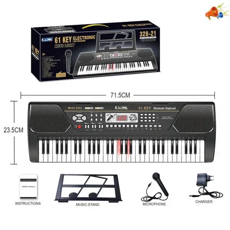61 клавіша 300 звуків 300 готових ритмів 5 клавіш ударних клавіші ударних з можливістю вибору клавіші з підсвічуванням та функцією відключення 15-рівневе регулювання гучності стереодинаміки світлодіодний дисплей система запису/відтворення регулювання темпу синхронізація регулювання гучності демо-мінусівки живлення від зарядного пристрою вхід для мікрофона (вхід miniJACK) лінійний вхід для підключення, наприклад, плеєра або телефону (miniJACK)