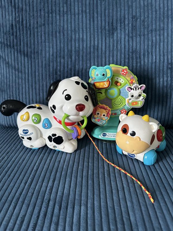 Іграшка на присосці Vtech Learn Ferris Wheel музична розвиваюча карусель Кожне натискання кнопки активує веселі звуки та мелодії, також грають мелодії при обертанні. Мова англійська. Корівка грає мелодії при натисканні на кнопочки також коли котиться теж грає мелодія. Англійською Собака співає французькою багато мелодій.