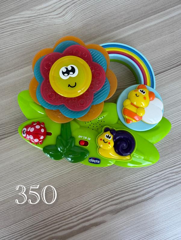 4 ігрові сенсорні зони: Квітка – 3 пелюстки з різною текстурою, які активують музичні та світлові ефекти при правильному складанні. Сонечко – курсор, який можна переміщати зліва направо і навпаки. Равлик – кнопка, яка активує музику та світлові ефекти. Бджілка – перемикач, який можна повертати. активація "беззвучний режим", щоб дитина змогла зосередити увагу тільки на світловий стимуляції й власних діях. В коробці, є інструкція. Іграшка має дефект: одна квітка тріснула. Можна заклеіти чи грати без неї.