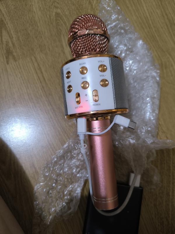 Беспроводной караоке-микрофон WSTER WS-858. Это оригинальное устройство, сочетающее в себе вокальный Bluetooth микрофон и универсальную стерео колонку. Его можно использовать в качестве MP3-плеера, портативной колонки, радиоприемника или караоке-микрофона в сочетании со смартфоном или планшетом. Имеет беспроводное Bluetooth соединение, совместимо с телефонами Android и iOS. Позволяет воспроизводить музыку со смартфона и записывать собственные композиции (встроенный слот для карты памяти для записи музыки в формате MP3). Особенности включают: версия Bluetooth V4.0 + EDR, мощность динамика 5 Вт, частота 100 Гц-10 кГц, время работы 5-8 часов.