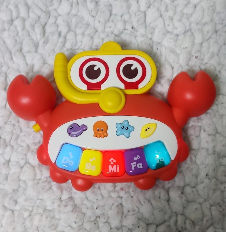 Краб казкарь. На україньскій мові - під клешнею краба знаходиться кнопка увімкнення іграшки; - у центральній частині іграшки розташовано 9 функціональних кнопок; - 4 кнопки із зображенням морських мешканців відтворюють 12 казок українською мовою; - барвисті клавіші піаніно дозволять малюкам зіграти 5 музичних нот; - іграшка призначена для малюків від 18+ місяців; - іграшка дозволить малюку познайомитися з новими кольорами та формами, развивать дрібну моторику та слух. Іграшка робоча