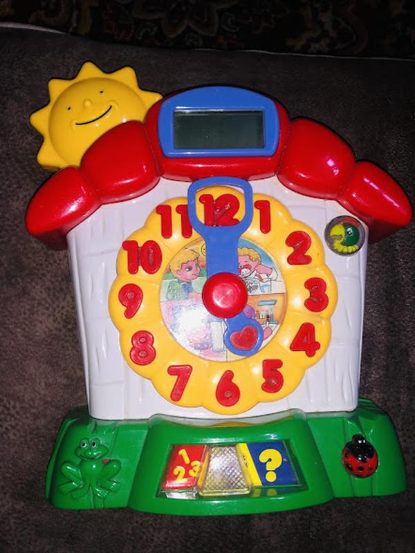 дитяча розвиваюча іграшка "Годинник знань". Призначена для навчання визначенню часу та цифр. Поєднує аналоговий і цифровий годинник. Включає інтерактивні кнопки з цифрами та знаком питання для ігрового навчання. Має яскравий дизайн з елементами у вигляді сонця, жаби та сонечка.