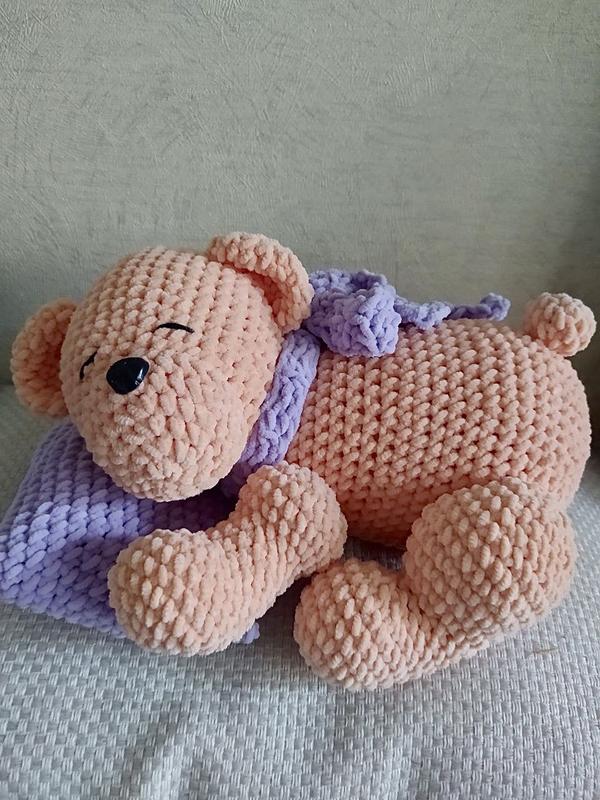 Мишка в нежно персиковом цвете. Вместе с шарфиком и подушкой фиолетового цвета. Нити: YarnArt DOLCE BABY Наполнитель: холлофайфер Отпрашиваю по безопасному обмену ❤️ Цена: 430 грн Больше вариантов мягких игрушек ручной работы смотрите у меня в профиле 🇺🇦