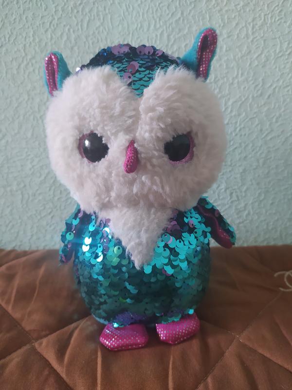М'яка іграшка Сова в пайєтках, в дуже хорошому стані, ззаду трохи по шву розійшлося. Пайєтки перегортаються, колір блакитний з фіолетовим. Зріст 18 см.