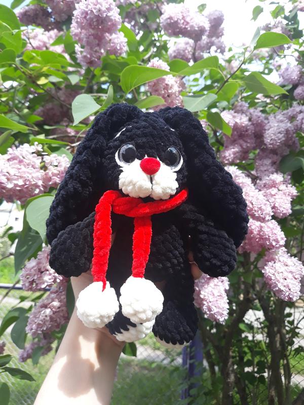 Зайка связан из плюшевой пряжи. Наполнитель холлофайбер. Глазки и носик на безопасном крепление. Отправляю новой почтой и укрпочтой. Также можете посмотреть другие игрушки в моих объявлениях.