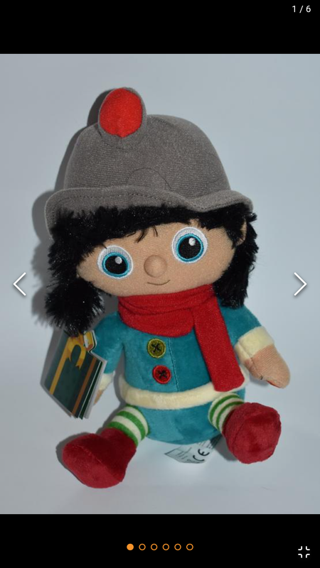 Нова, без бирки, сток. Мила м'яка музична іграшка, персонаж мультфільму "Пожежники". При натисканні на ліву долоньку видає звуки і горить ліхтарик на шапочці. Всередині на спинці пристрій для батарейок. Висота 25 см,ширина 17. Германия.