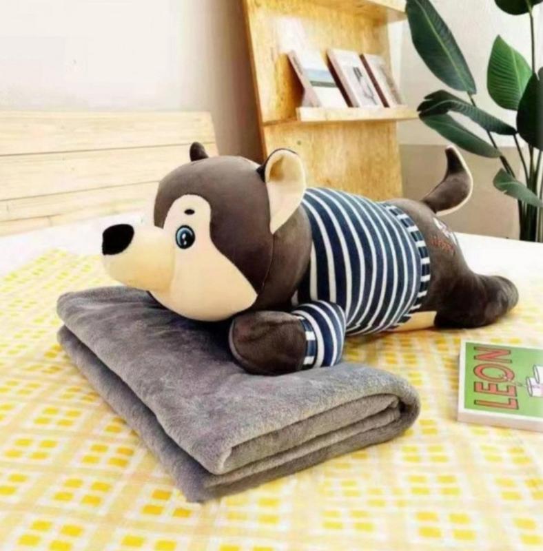 Плюшева іграшка (55х25х20см), всередині неймовірно ніжне флісова покривало 150х110см. Відмінно підійде в якості іграшки, подушки, покривала, пледа, легкого ковдри. Флісова тканина виготовлена з тонких і м'яких синтетичних волокон. Її важливою особливістю є здатність вивести назовні випаровування поверхні тіла. Такі якості виріб має завдяки нетканій технології, яка в основу закладає поліестерні волокна. Це дозволяє видалити вологу, залишивши її на тканині, не втрачаючи при цьому бажане тепло.