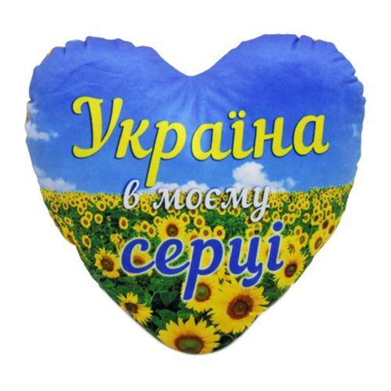 Декоративна подушка у формі серця, на якій зображено поле соняшників із написом "Україна в серці" (українською мовою). Буде прекрасним сувенірним подарунком. М'яка та оксамитова на дотик. Розмір: 32х35х8 см.