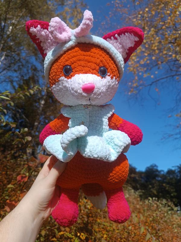 Лисичка виготовлена з якісної плюшевої пряжі Alize Velluto. Пряжа гіпоалергенна, очі та носик на безпечному кріпленні. Одяг знімається. Зріст ~ 40 см Ручна робота