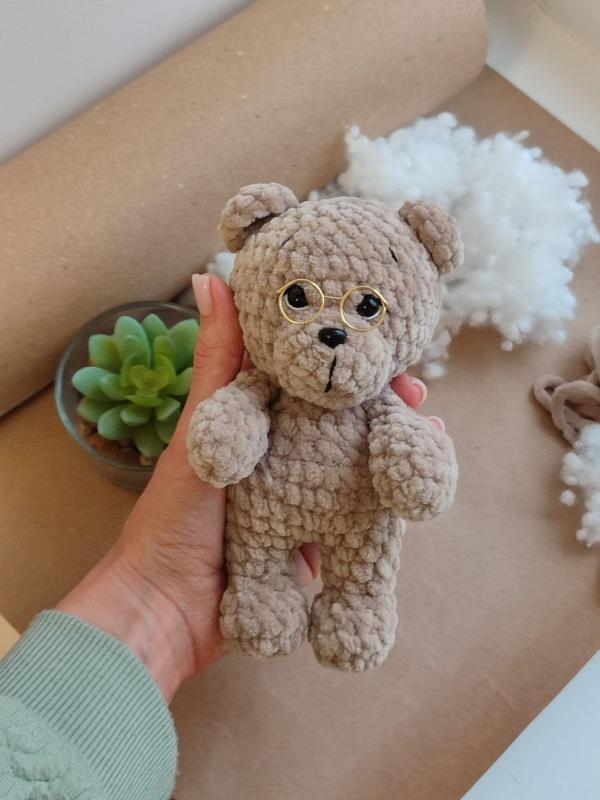 под заказ Вязаный мишка из плюшевой пряжи! Глазки и носик на безопасном креплении, очки снимаются. Рост 15 см. под заказ в цветах, изготовление до 2х дней.