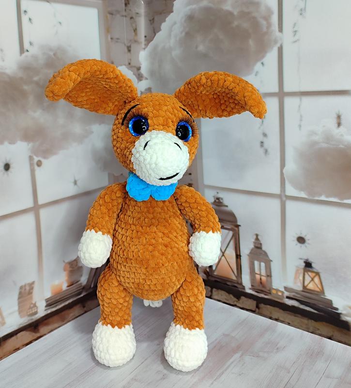 Віслюк. Віслюк іграшка ручної роботи, зв'язаний з плюшової пряжі. Очінята на безопасному кріпленні. Наповнювач гіпеалергенний холофайбер. Висота іграшки 35см