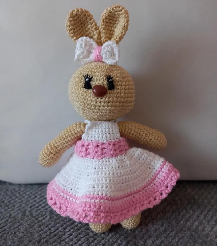 Вязаный зайчик ручной работы. В наборе зайчик, платье, бантик. Размер: 25 см