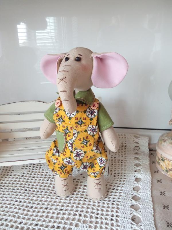 Текстильна іграшка ручної роботи. Зростання слоника 27см. Самостійно стоїть і сидить. Ручки,ніжки й голова рухливі. Одяг не знімається.