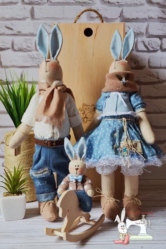 Сім'я виконана на замовлення. Зшию в будь-якому кольорі і стилі. Зростання дорослих зайцев 31 см, з вушками 38, самостійно стоять і сидять, ручки і ніжки рухливі. Зростання малюка 13 см, ручки рухомі. У комплект входить дерев'яна конячка Сім'я може бути упакована в фанерну коробку. Коробка оплачується додатково Термін пошиття 15 робочих днів Додаткові характеристики: Вид: Зайчик Товар виготовляється на замовлення