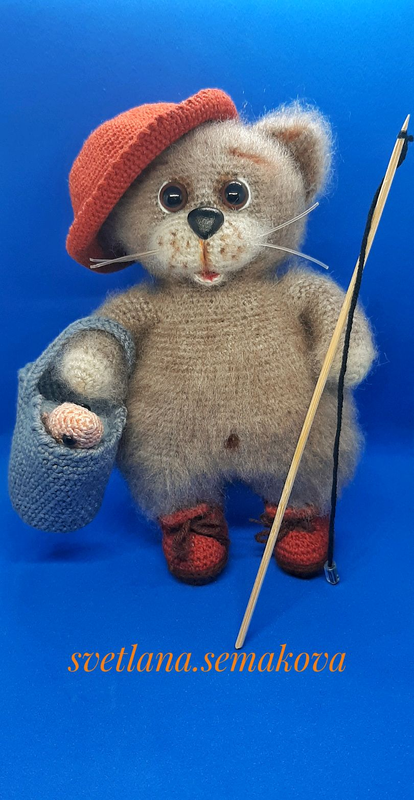Тип іграшки: Тварини Котик зв'язаний з мохеру, на дротяному каркасі. Бриль та відерце з золотою рибкою знімаються. Може змінювати пози завдяки каркасу.