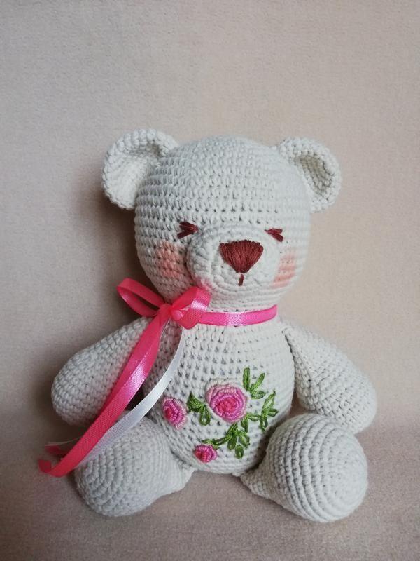 Мишко в'язаний з вишивкою рококо в стилі шеббі шик. Виконаний з х/б пряжі YarnArt jeans, прикрашений вишивкою "Троянди" і атласними стрічками. Зростання ведмедики сидячи 18 см, стоячи 23 див. Мишко виглядає дуже святково і ніжно. Наближається весна і такий ведмедик буде прекрасним подарунком для милих дівчат і дам. Під замовлення. Срок виготовлення 3 дні. Додаткові характеристики: Стать: Для дівчаток Вид: Мишко