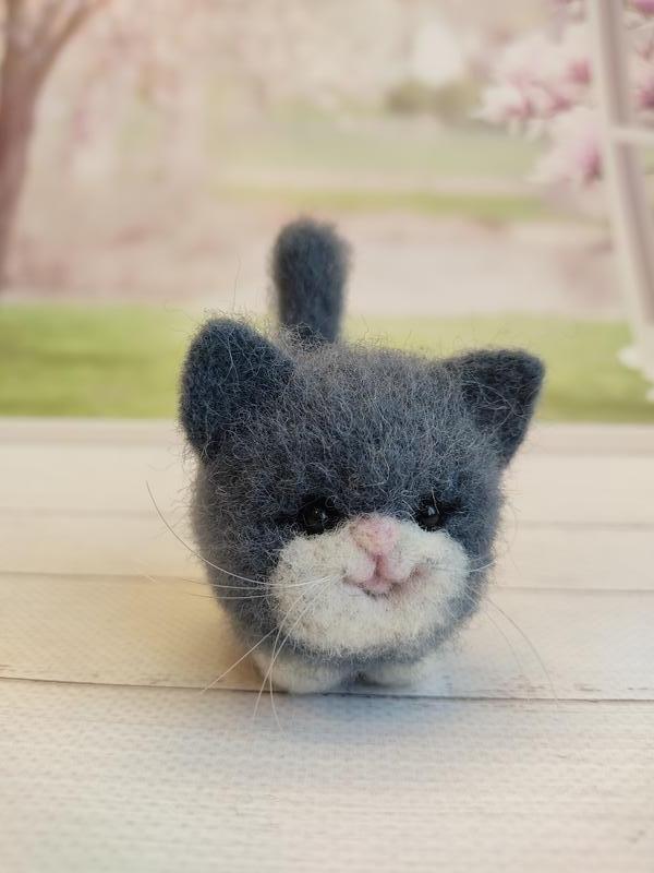 Важний сірий котійка! Круглий, щокастий симпатяга зваляний з вовни з любов'ю! У котика чорні блискучі очі і солодкий рожевий носик. Котика так не хочеться випускати із рук! Котик може стати чудовою прикрасою інтер'єру, цікавою іграшкою, частиною колекції, оригінальним подарунком рідним та близьким! Довжина котика близько 6 см, ширина 4 см. Напишіть мені, і я із задоволенням виконаю для вас кошеня, або іншого звірка за вашим бажанням, по вашим фото.