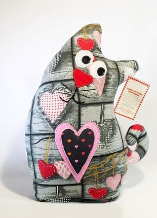 Інтер'єрна Подушка-іграшка Котик виконана з 100% бавовни , наповнювач-гіпоалергенний холлафайбер. М'яка і обнимательная .Виконана із застосуванням аплікації та витинанки. Колір і дизайн за бажанням покупця. Розмір 35 см на 25 см Матеріал польська бязь.