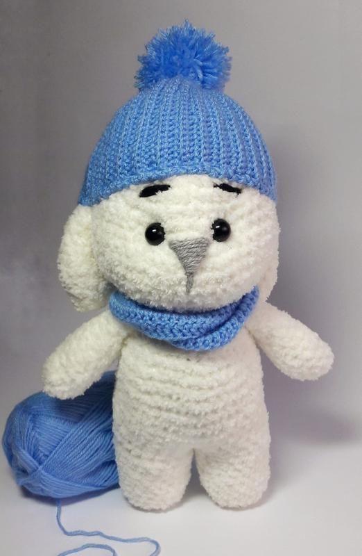 Іграшка ручної роботи. Виготовлена з дитячої плюшевої пряжі, наповнювач синтапон або холофайбер. Очі на безпечному кріпленні, інші деталі вплетені або міцно пришиті. Колір шапочки та шарфа можна вибирати. Товар виготовляється на замовлення